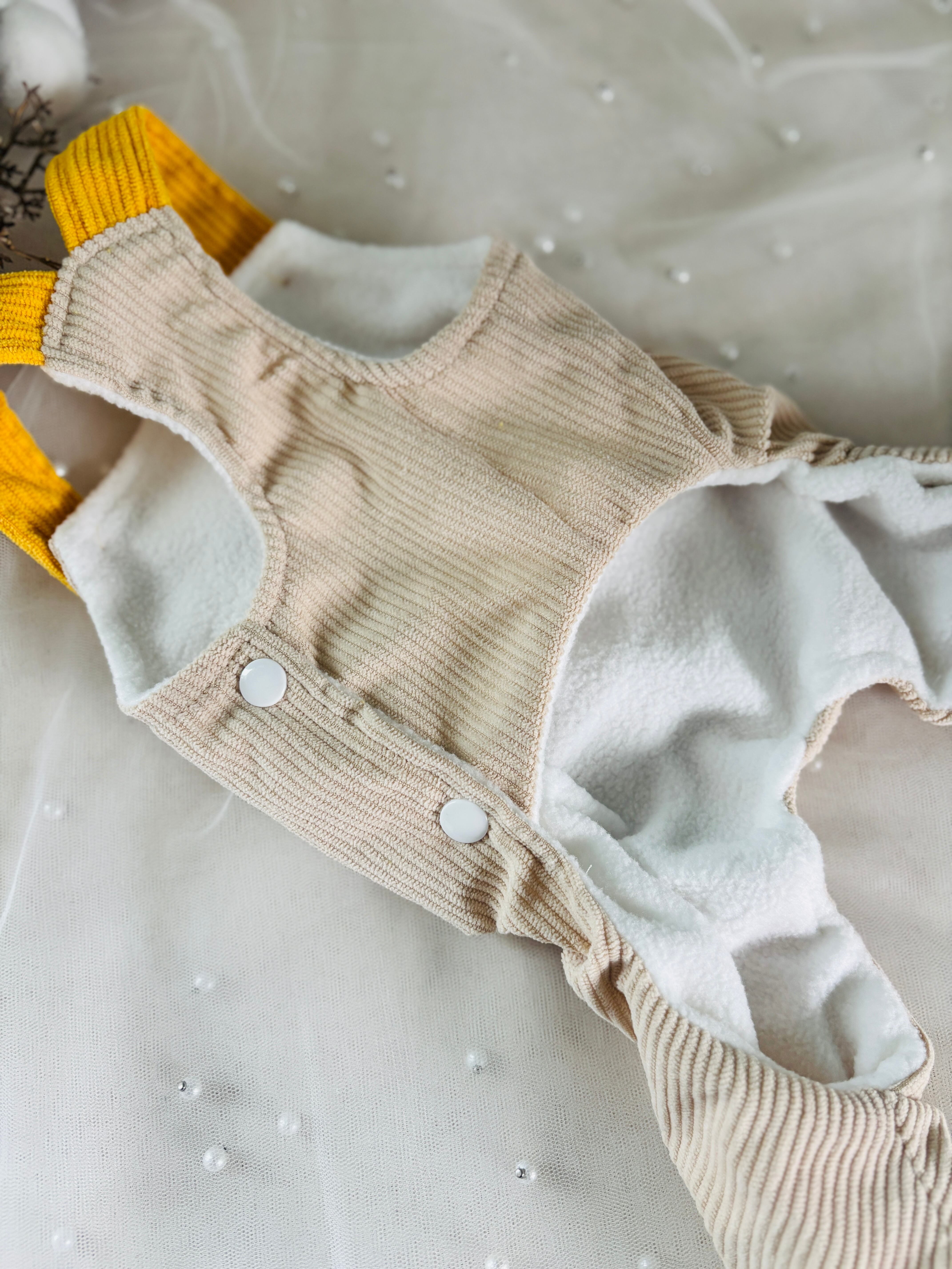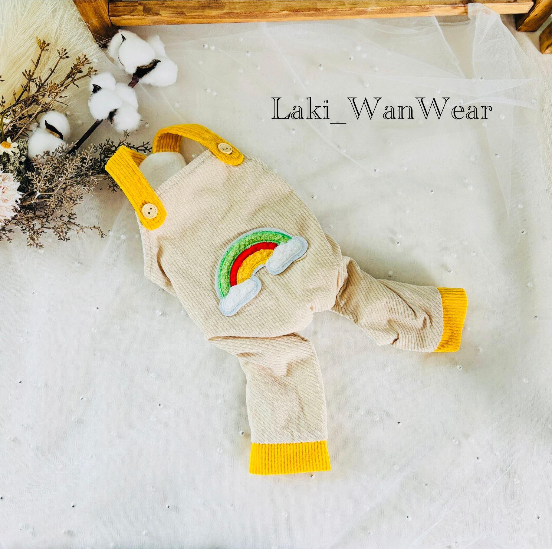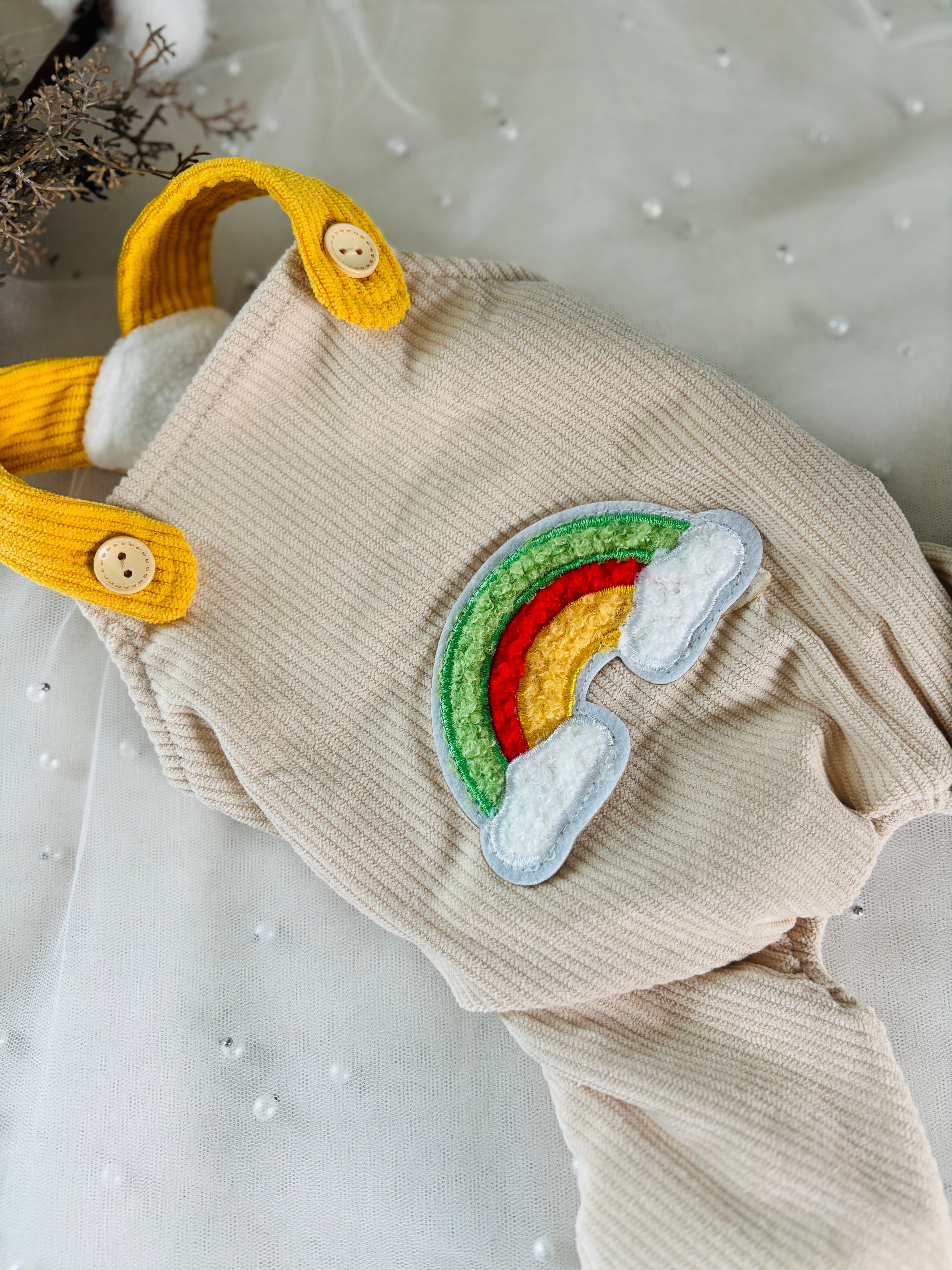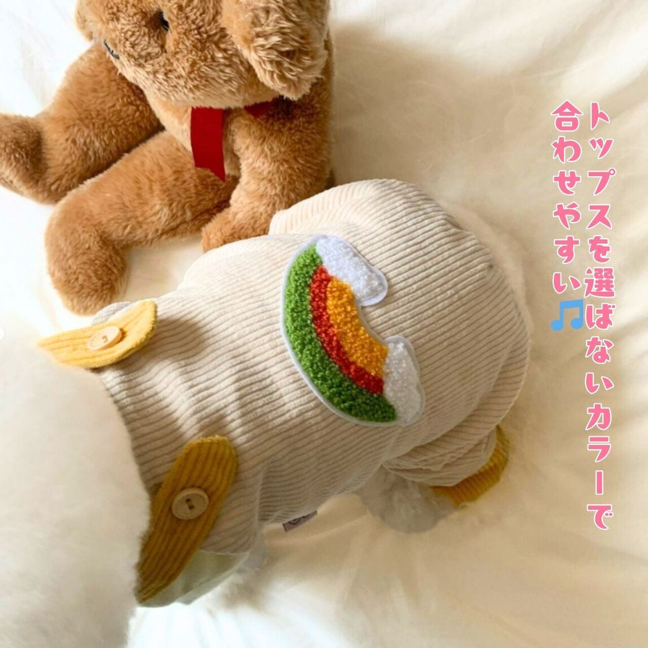 もこもこレインボーのワッペンが映えるサロペットです♪