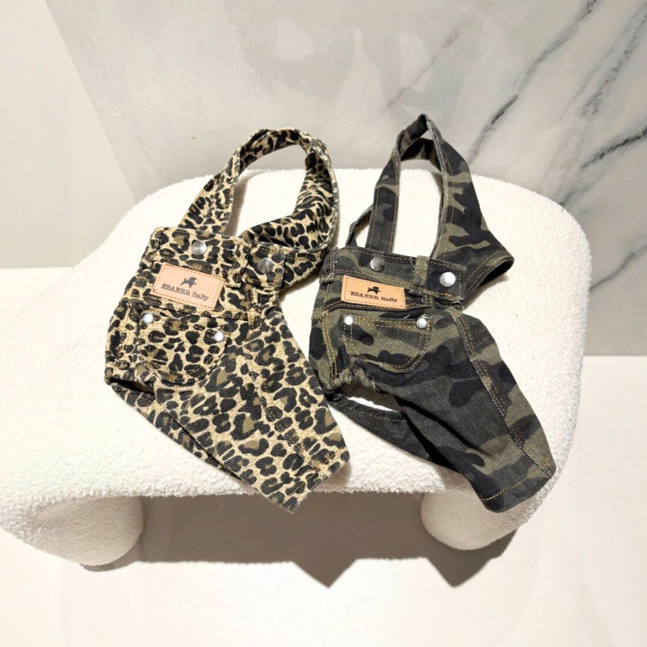 レオパード柄、カモフラ柄が特徴のサロペットパンツ【大きめサイズ】です。