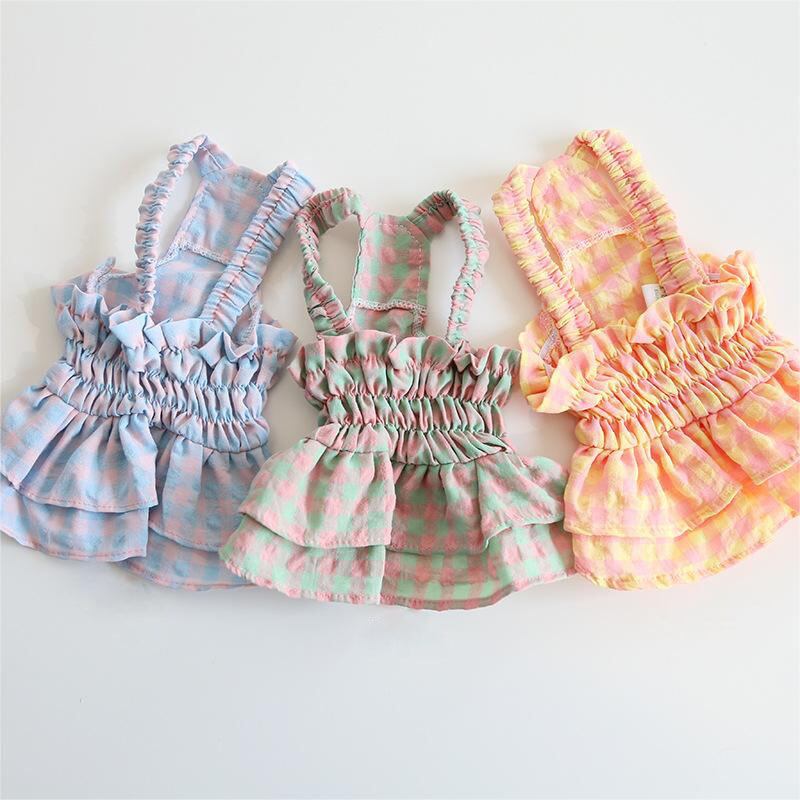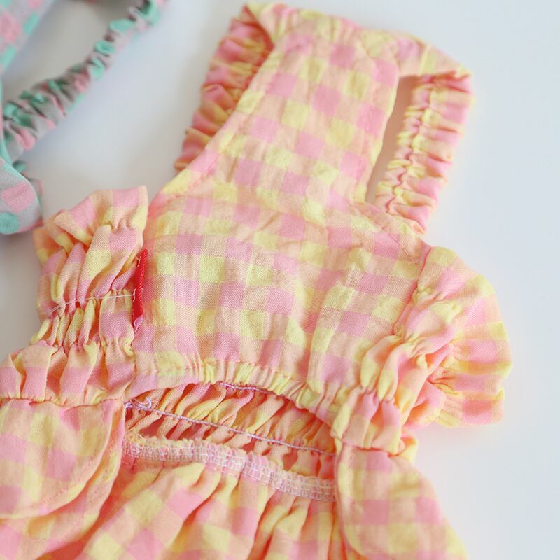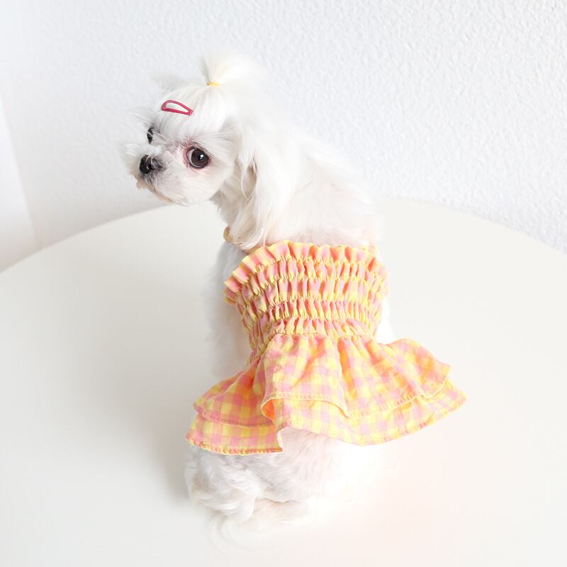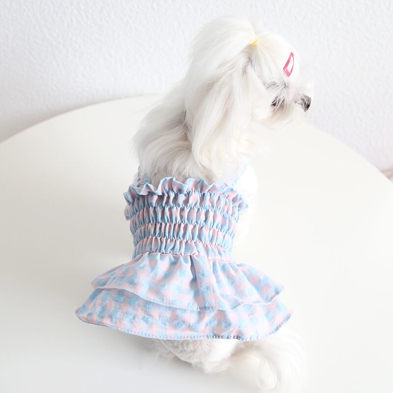 軽やかな素材感とガーゼのようなふんわりチェック柄がかわいい、ガーリースタイルの犬用ワンピースです。
