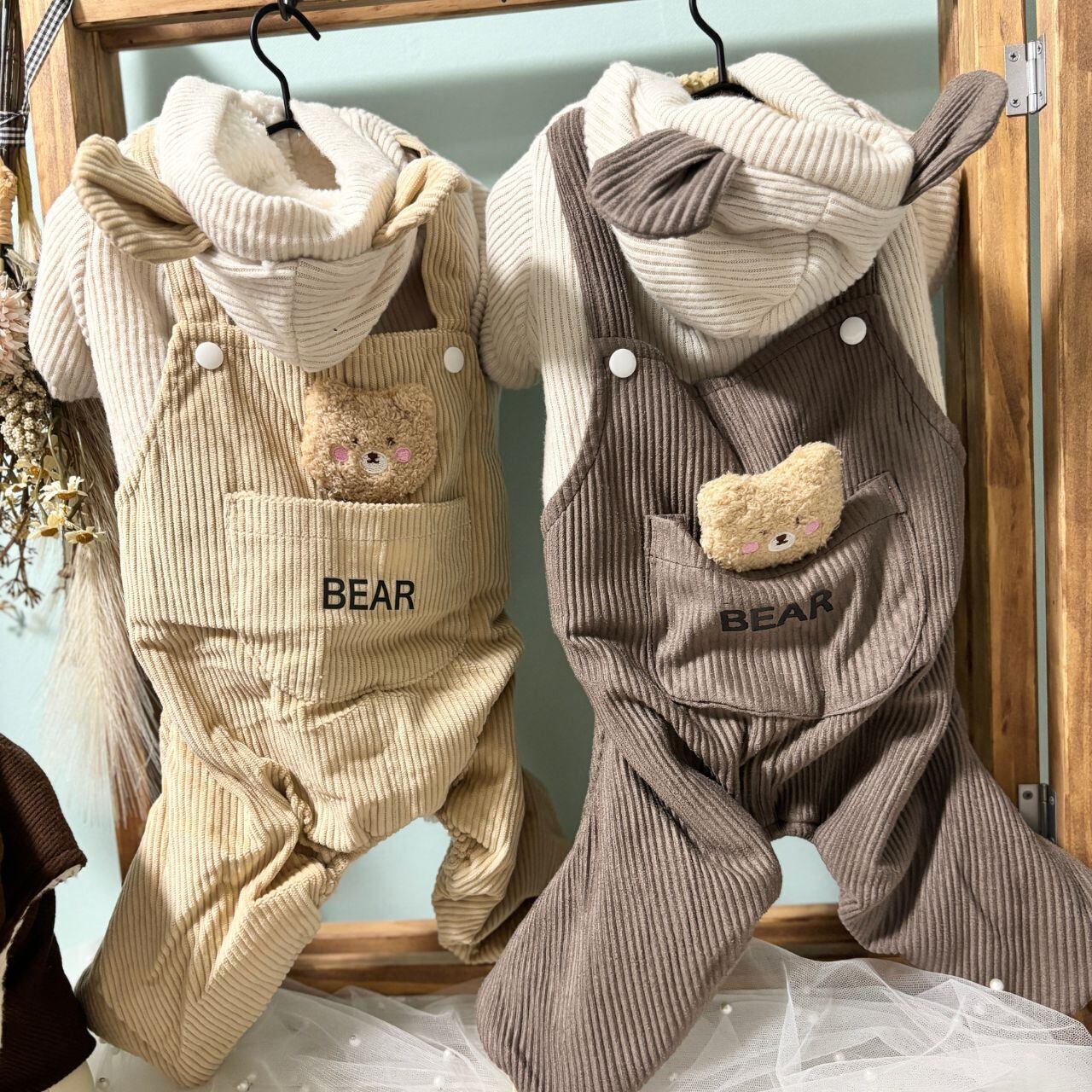 クマちゃんのモチーフ付き、フードロンパースです♪